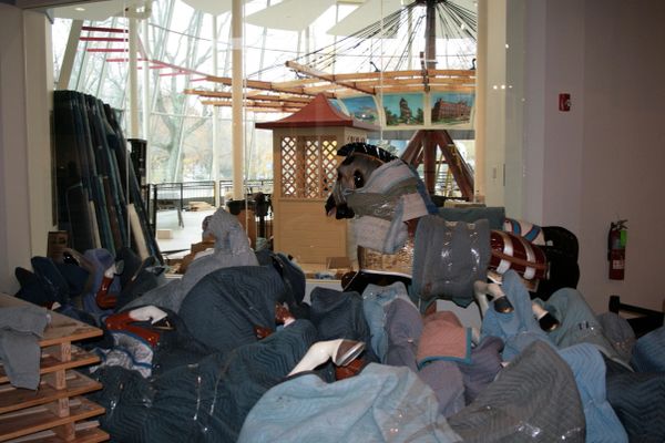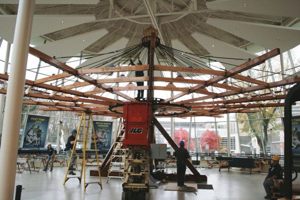 After researching carousel restoration firms in Ohio, a contract was signed with Carousel Works, Mansfield, Ohio to have them restore/repair the frame and mechanism of PTC#19. Carousel Magic who restored the horses and chariots back in 1998 was now out of business. Carousel Works is the largest manufacturer of wooden carousels in the world. They specialize in making carousel magic by pioneering the production of over 45 new innovative wooden carousels located in cities across the country. They take pride in providing customers with the utmost quality of craftsmanship; the unique aesthetics of its experienced artisans; and the dream-like quality of the wooden and brass carousels. Their strength is the ability to manage a carousel project from conception to installation all under one roof. Carousel Works is bringing back the lights, music and magic of carousels one city at a time! On two consecutive days in November of 2011 a crew from Carousel Works loaded and moved #19 parts from two WRHS storage areas to their facility in Mansfield, OH. As reported back in 1997, when PTC#19 was dismantled at Palace Playland for the move to Cleveland for auction, some pieces were damaged including the platform and ring gear. The horses and chariots were loaded for the trip from Maine to Ohio and the other pieces of the carousel placed in three storage facilities. The firm contracted after the auction to retrieve the parts in storage knew of only two. The parts in the third were discarded by the time someone realized items were missing.