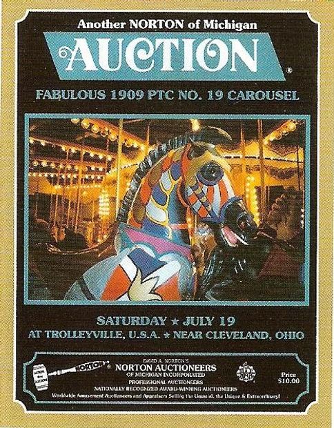 A February 1997 newspaper article reported Palace Playland was sold two months prior, to two gentleman who lived in Florida and owned eight of the park’s rides. The article continued the two new owners were working to keep the carousel in town as was the foundation that owned the carousel. We know those efforts failed. Later in 1997 Norton of Michigan was contracted to hold the auction for PTC#19. It was rumored individuals suggested to Norton of Michigan to hold the auction in the Cleveland area, because of the nostalgia and attachment Clevelanders have with Euclid Beach Park higher prices could be obtained. The auctioneer knew of the Euclid Beach Park Nuts. In 1982 Shady Lake Park closed, the Humphrey Family deciding to devote more time to its popcorn, popcorn ball, and candy kiss business. Most of the items from their Shady Lake Park were sold and found their way to Old Indiana Fun Park located in Thornton, Indiana. That park closed with all assets going up for auction under Norton of Michigan in February of 1997. Many EBPN members and Clevelanders made the drive to the auction to bid on and take home some Euclid Beach Park memorabilia, noted by Norton of Michigan. In the early spring of 1997 a call from Norton of Michigan was made to the then President of EBPN asking if he knew of a venue where the auction for #19 could be held. Coincidently, EBPN had planned for a memorabilia show on the west side of Cleveland at Trolleyville, U.S.A. on July 19, 1997. Trolleyville was an operating trolley museum with about 35 trolleys in its collection including one that once carried park-goers to Euclid Beach Park. The memorabilia show was billed as “Ride a Trolley to Euclid Beach.” The trolley museum has closed in 2005.