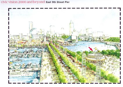 The Trust for Public Land purchased the carousel in behalf of Cleveland Tomorrow and was paid back. Founded in 1981 Cleveland Tomorrow was a private civic organization made up of more than 50 chief executive officers of the largest companies in the Cleveland area. December 4, 1997 at the 25th anniversary luncheon of the Cleveland Restoration Society the then incoming chairman of Cleveland Tomorrow unveiled from under white sheets; the outside row lead armored and garland horses. He made the announcement that the proposed site for the Euclid Beach Park Carousel would be Cleveland's East 9th Street Pier. Plans were to restore and preserve the carousel as a year-round attraction at North Coast Harbor now known as Voinovich Bicentennial Park. Also announced was that the Western Reserve Historical Society had been brought in as a partner to oversee the carousel's preservation. At that time it was hoped that everything would fall into place so the carousel could open Spring or early Summer of 1999. Cleveland Tomorrow's chairman headed a 19 member committee working to update the city's 8 year old downtown development plan, Civic Vision 2000 and Beyond. Plan included the reorientation of downtown Cleveland toward the waterfront.