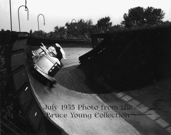 The unloader controlled a brake in the short section that followed to stop or slow down the train as it rolled to the unload brake. All brakes were normally closed except for the emergency brake which had to be activated by the operator. After the straightaway the track split to the right running track or to the left storage track. A switch had to be manually thrown to take a train off onto the storage track. The cars were jointed in the middle to make them more flexible while negotiating the tight turns. Sometimes a bolt in this joint would break and the train would have to be removed from operation. To detect this problem, an operator would regularly have to walk the barrel looking for broken bolts as well as hats, wigs, false teeth, coins, etc. The barrel was painted where the trains normally ran. You could, in theory, stand on the unpainted surface and let the trains race past you; however, this would not be wise and was not permitted. A stairway connected several levels of the barrel and provided platforms on which to stand while the train flew by you. The anti-rollbacks on the lift hill were quite loud so that an operator walking in the barrel knew that a train was coming and should step out of the barrel. When a broken bolt was found, the train had to be located. One would be pulled, hoisted, and inspected. If you were lucky, it would be your first guess which made you and the mechanics very happy. During the time I worked on the ride, any money found was kept in a box and it unclaimed would go toward a party at the end of the season. As mentioned earlier, when the lift was bumpy quite a bit of loose change ended up in the barrel and eventually in the box. Every evening near closing time, Mr. Johnson, the park manager, would take up a position near the THRILLER and FLYING TURNS. He would look at the crowd and look at his watch. When he raised his arms, the park was closed and the three high rides would race to be the first to turn off their track lights. If you were a lucky last minute rider you might end up having a thrilling ride in the dark! During my last season at the park I was the straw boss of the FLYING TURNS. There was on day that I will never forget. It was the Goodyear Picnic, one of the busiest days of the year and one in which we set a record of over 6000 riders on the ride.